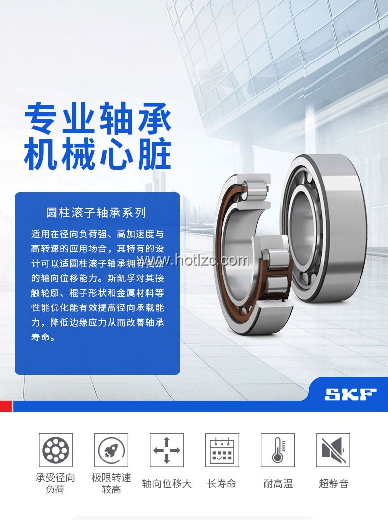 圓柱滾子與滾道為線接觸軸承。負荷能力大,主要承受徑向負荷。滾動體與套圈擋邊摩擦小,適于高速旋轉。根據套圈有無擋邊,可以分有NU、NJ、NUP、N、NF等單列圓柱滾子軸承,及NNU、NN等雙列圓柱滾子軸承。該軸承是內圈、外圈可分離的結構。